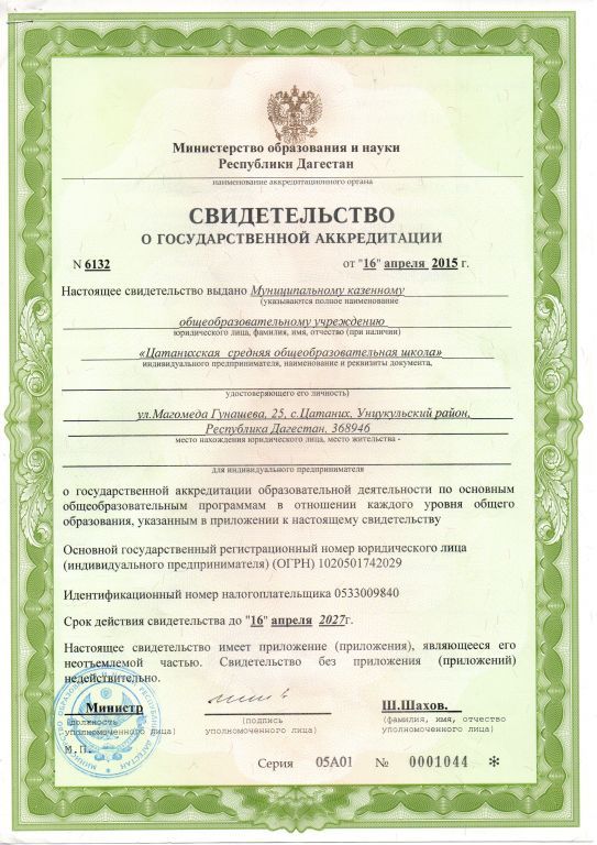 | Адрес местонахождения образовательной организации* | 368946, Республика Дагестан, Унцукульский район, с.Цатаних, улица Магомеда Гунащева, 25 |